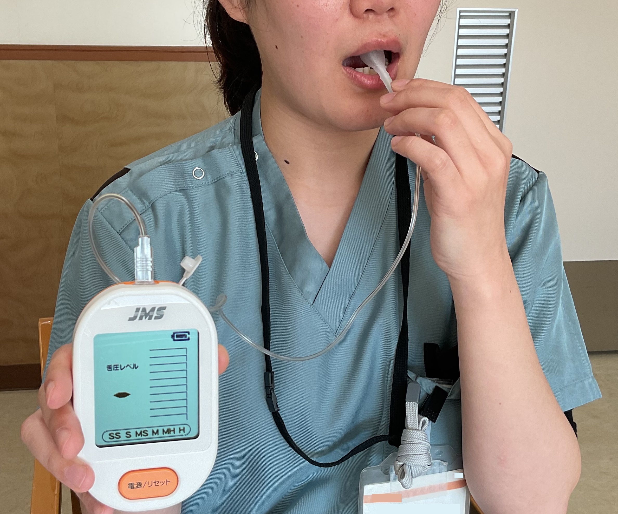 専用の器具で舌の力を鍛える練習を行っています。退院後もおいしく食事が食べられるように、患者様一人ひとりに合わせた食事の形や姿勢について提案いたします。