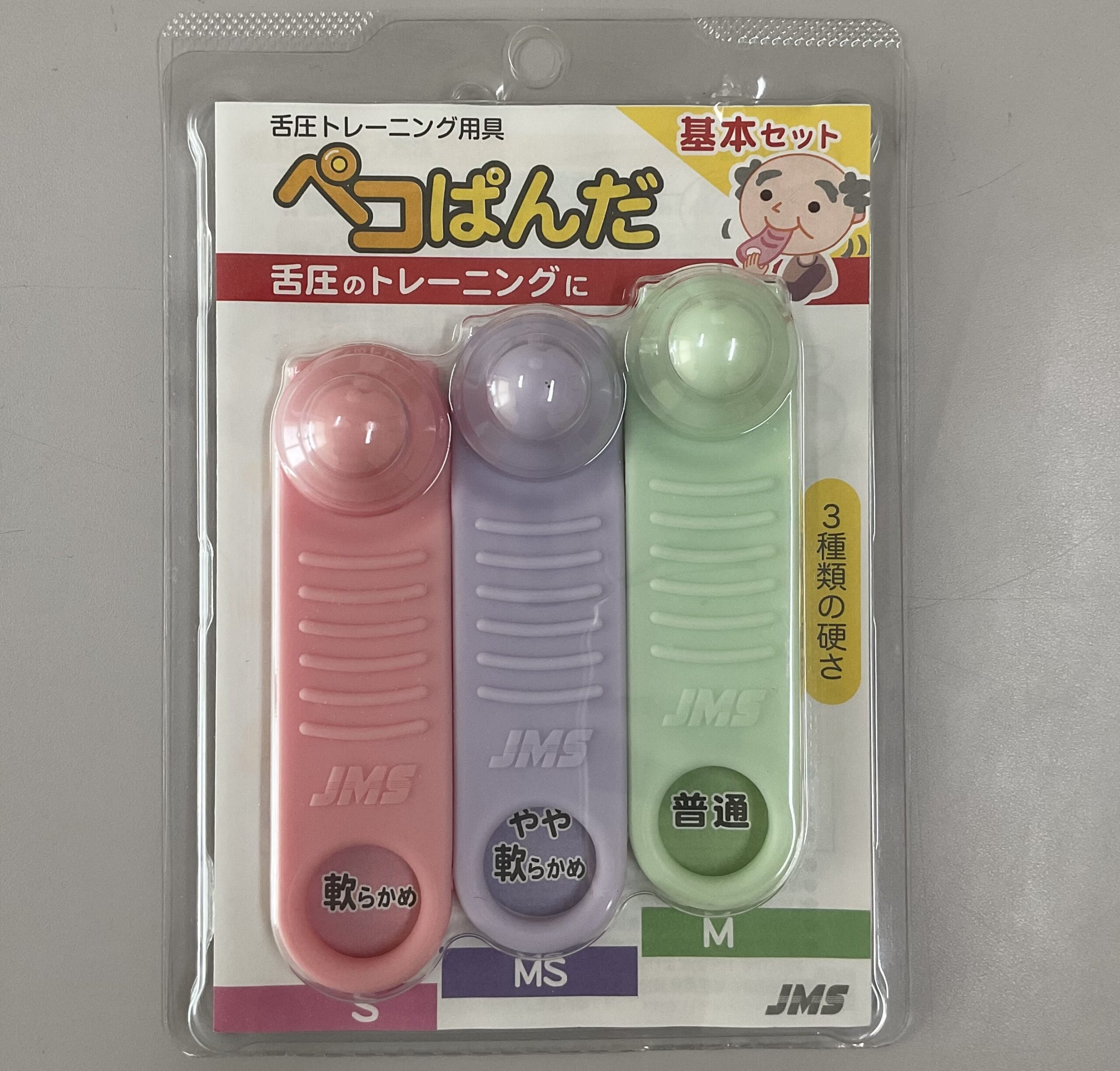 ペコじーなの測定結果から、患者様一人ひとりに合わせた硬さのものを使います。舌で上あごに押し上げる力を鍛えることで、飲み込む力が強くなります。